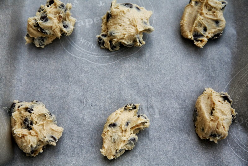 Mąkę wymieszkać z sodą i solą, pozostawić w miseczce. W drugiej misce utrzeć masło z cukrem, aż do momentu uzyskania jednolitej masy. Powoli dodać ekstrakt waniliowy i jajka. Ubjać jeszcze przez 2 minuty. Dodać sypkie składniki zimiksowac, dodać czekoladę i wymieszać delikatnie łyżką.