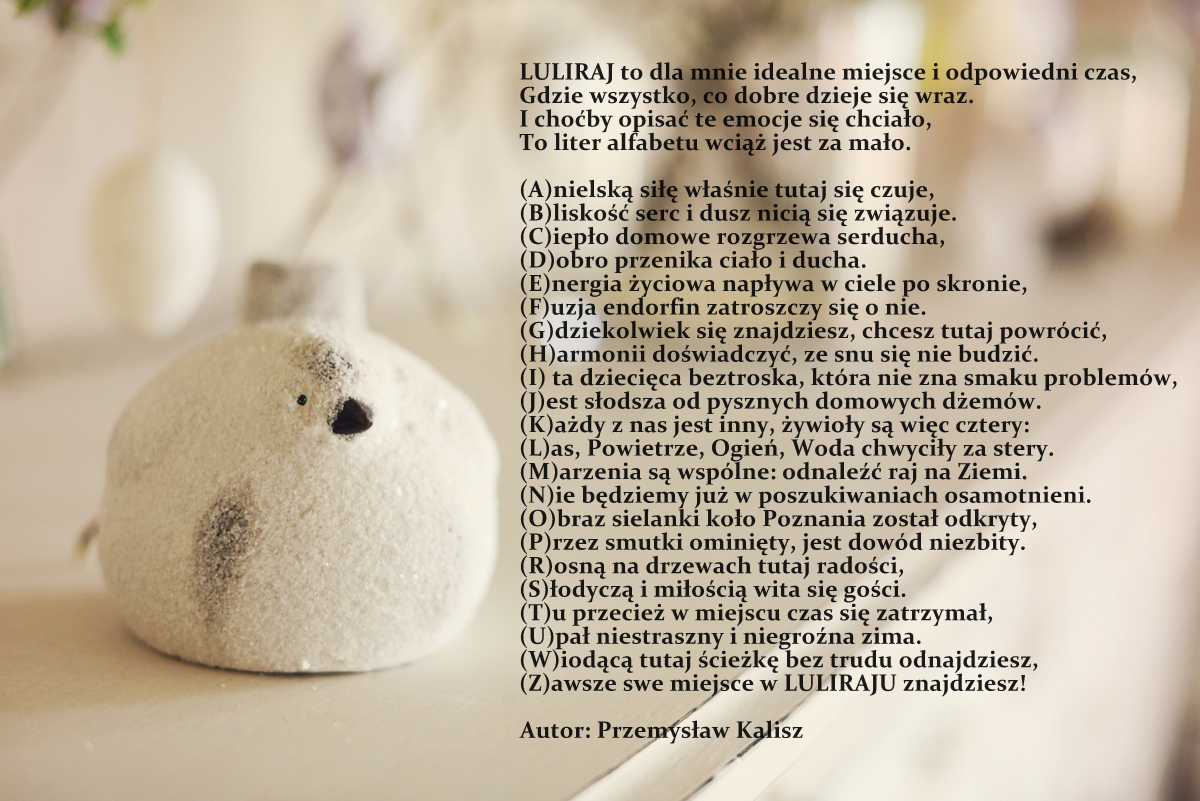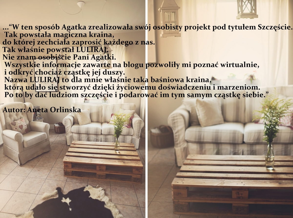 Nie znam osobiście Pani Agatki. Wszystkie informacje zawarte na blogu pozwoliły mi poznać wirtualnie i odkryć chociaż cząstkę jej duszy. Nazwa LULIRAJ to dla mnie właśnie taka baśniowa kraina, którą udało się stworzyć dzięki życiowemu doświadczeniu i marzeniom. Po to by dać ludziom szczęście i podarować im tym samym cząstkę siebie.