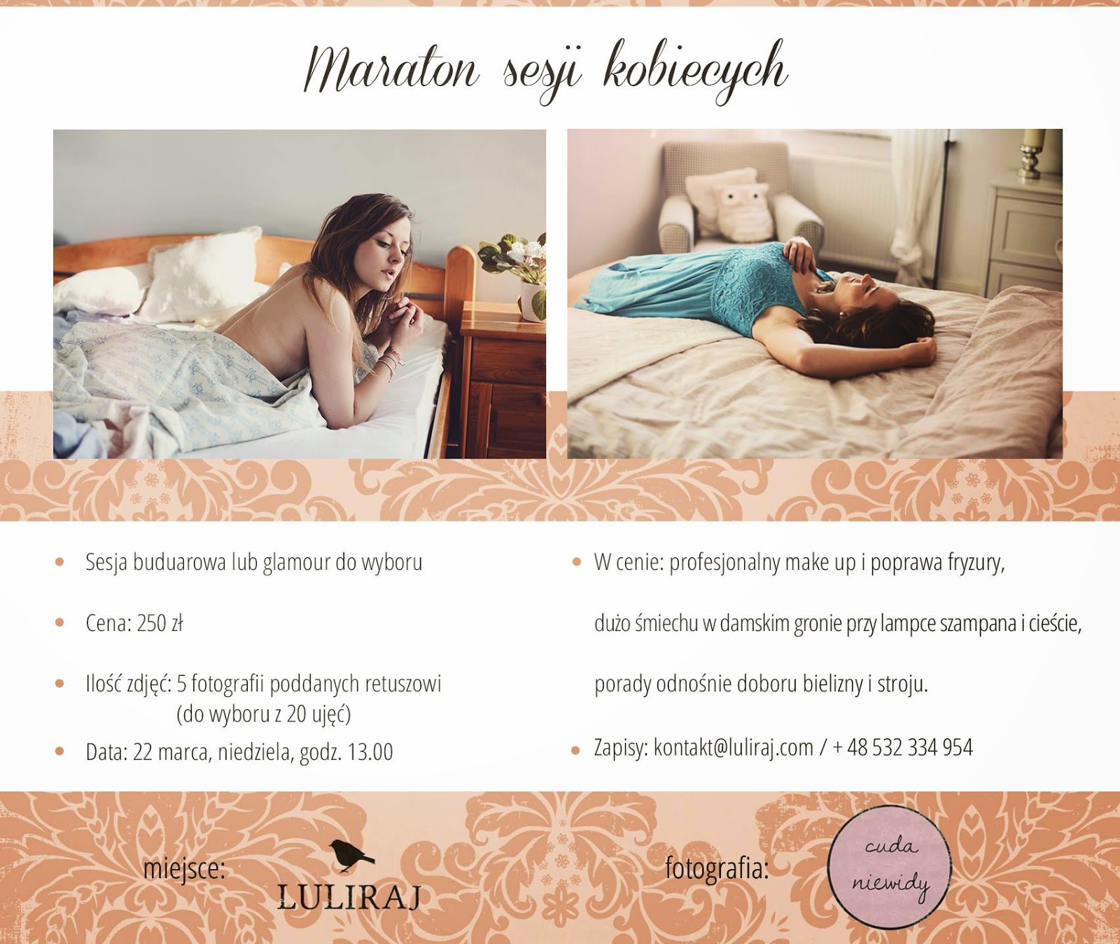 Zapraszamy Was do LULIRAJ’u na Maraton Sesji Kobiecych. Razem z Magaleną Błaszczyk z Cuda Niewidy przygotowałyśmy dla Was sesję buduarową, lub glamour.